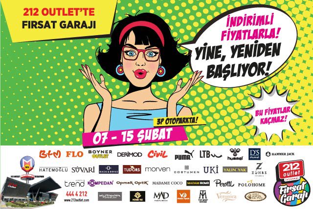 212 Fırsat Garajı, 7 – 15 Şubat tarihleri arasında 212 Outlet’te açılıyor. Fırsat Garajı’nda; tekstilden ayakkabıya, ev dekorasyonundan halıya, parfümden oyuncağa, zücaciyeden optiğe dünyaca ünlü markalar, en düşük fiyatlarla sizleri bekliyor.