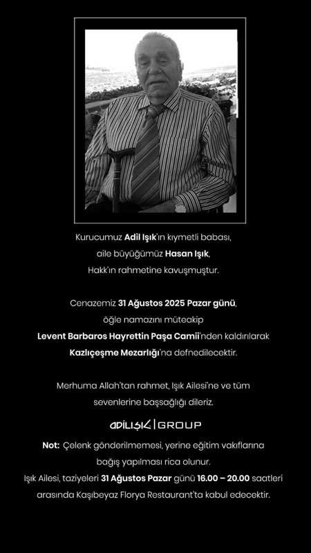 Türkiye’nin perakende sektörüne yön veren isimlerden Adil Işık’ın babası Hasan Işık hayatını kaybetti. Hasan Işık’ın cenazesi 31 Ağustos Pazar günü Levent Barbaros Hayrettin Paşa Camii’nde kılınacak öğle namazının ardından Kazlıçeşme Mezarlığı’na defnedilecek.