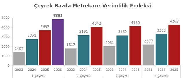 Çeyrek bazlı metrekare başına düşen cirolarda birinci çeyrekte bir önceki yılın aynı dönemi ile karşılaştırıldığında ve enflasyondan arındırılmadan incelendiğinde yüzde 32’lik bir artış yaşanmıştır. 2026 yılı birinci çeyrekte metrekare verimliliği 17.553TL şeklinde gerçekleşti.