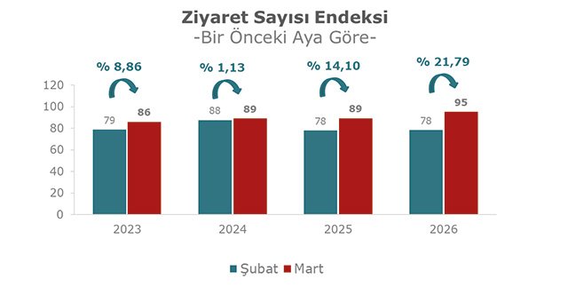 Mart 2026 verileri bir önceki yılın aynı ayı ile karşılaştırıldığında ziyaret sayısı endeksinde yüzde 6,7 oranında artış olduğu gözlemlendi. Şubat 2026’ya göre ise ziyaretçi sayısında yüzde 21,79 oranında artış kaydedildi. Ziyaret sayısı endeksinde birinci çeyrek bazında geçtiğimiz yılın aynı dönemiyle karşılaştırıldığında yüzde 3’lük artış görüldü.