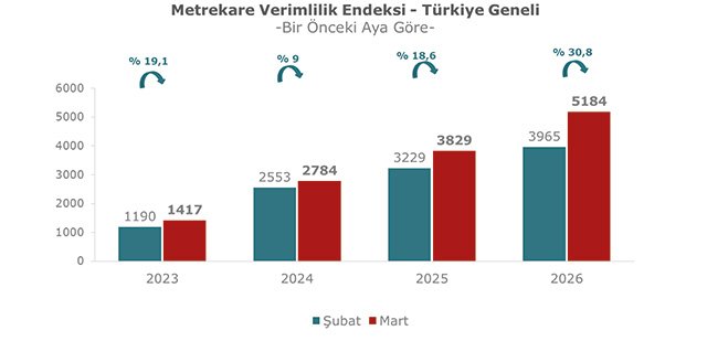 Mart 2026 döneminde kategoriler bazında metrekare verimlilik endeksi, Şubat 2026 dönemi ile karşılaştırıldığında ve enflasyondan arındırılmadan incelendiğinde; “Ayakkabı” kategorisinde yüzde 56,7, “Giyim” kategorisinde yüzde 44,6, “Eğlence Hobi” kategorisinde yüzde 30,6, “Kişisel Bakım ve Kozmetik” kategorisinde yüzde 24,7, “Yiyecek İçecek” kategorisinde yüzde 23, “Diğer” kategorisinde yüzde 14, “Hipermarket” kategorisinde yüzde 13,8 ve “Teknoloji” kategorisinde yüzde 10,3’lük oranında artış yaşandığı gözlendi.