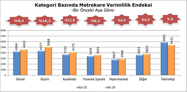 Ekim 2025 döneminde kategoriler bazında metrekare verimlilik endeksi, Eylül 2025 dönemi ile karşılaştırıldığında ve enflasyondan arındırılmadan incelendiğinde; giyim kategorisinde yüzde 16,2, ayakkabı kategorisinde yüzde 11,8, yiyecek içecek kategorisinde yüzde 6,2, hipermarket kategorisinde yüzde 4,9 ve diğer kategorisinde yüzde 4,9’luk artış görülürken teknoloji kategorisinde yüzde -8’lik azalış yaşandığı görülmektedir.