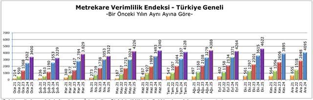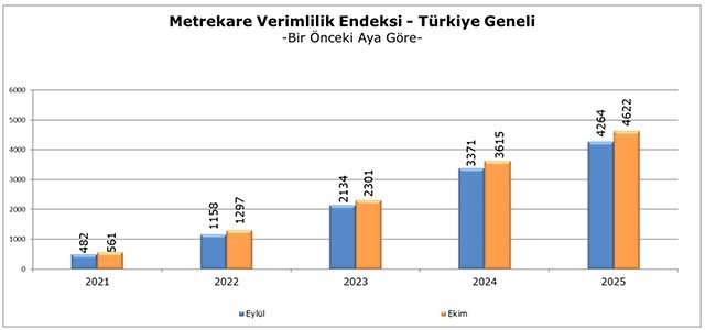 Ekim 2025 döneminde metrekare verimlilik endeksi, Eylül 2025 dönemi ile karşılaştırıldığında ve enflasyondan arındırılmadan incelendiğinde yüzde 8,4 oranında yükseliş göstererek 4622 puana yükselmiştir.