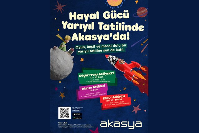 Sömestir tatilinde Akasya, 17–30 Ocak 2026 tarihleri arasında çocuklar ve ebeveynler için birlikte vakit geçirmenin keyifli bir adresi oluyor. Küçük Prens Atölyeleri, LEGO Deneyim Alanı ve MINISO özel etkinlikleri, çocukların hayal gücünü besleyen oyun ve keşif dolu deneyimler sunuyor. Akasya Kültür Sanat’ta (AKS) yer alan tiyatro ve sahne sanatları programı ile The Little Prince Exhibition ise yarıyıl tatili boyunca ailece deneyimlenebilecek kültür ve sanat odaklı bir buluşma alanı oluşturuyor.