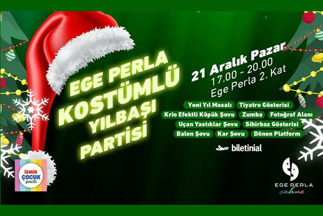 Tepe Emlak Yatırım A.Ş. yönetimindeki Ege Perla, 21 Aralık tarihinde, 17.00–20.00 saatleri arasında unutulmaz bir yılbaşı eğlencesi düzenliyor. İzmir çocuk şenliği ile birlikte düzenlenecek olan etkinlikler kapsamında; “Yeni Yıl Masalı”, “Tiyatro Gösterisi”, “Krio Efektli Köpük Şovu”, “Zumba”, “Uçan Yastıklar Şovu”, “Sihirbaz Gösterisi”, “Balon Şovu” ve “Kar Şovu” yer alacak. Gün boyunca sahnede kurulacak dönen platform ve özel olarak hazırlanan fotoğraf alanı, ziyaretçilere unutulmaz anılar biriktirme fırsatı sunacak.