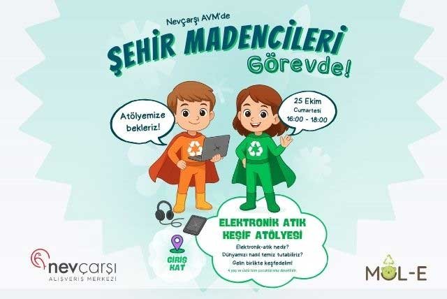 Nevçarşı Alışveriş Merkezi, sürdürülebilirlik ve çevre bilincini çocuklara erken yaşta kazandırmak amacıyla anlamlı bir etkinliğe ev sahipliği yapıyor. “Şehir Madencileri Görevde” sloganıyla gerçekleşecek elektronik atık keşif atölyesi, 25 Ekim Cumartesi günü saat 16.00 – 18.00 arasında düzenlenecek.