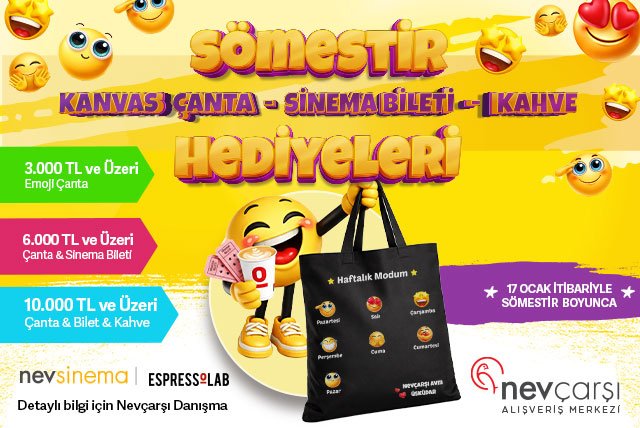 Kampanya kapsamında Nevçarşı AVM’den 3.000 TL ve üzeri alışveriş yapan ziyaretçiler emoji tasarımlı çanta hediyesinin sahibi olurken, 6.000 TL ve üzeri alışveriş yapanlara ise çanta ve sinema bileti hediye ediliyor. Ayrıca kampanya süresince ziyaretçilere kahve hediyesi de sunuluyor.