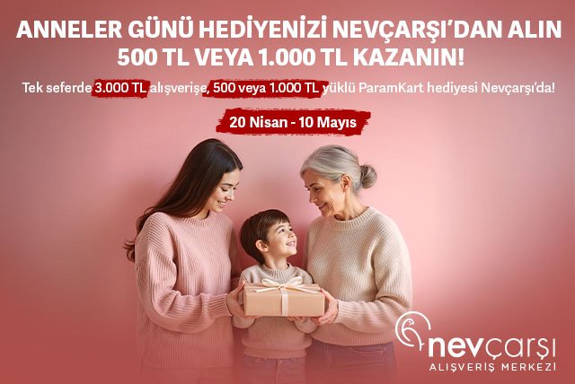 Nevçarşı Alışveriş Merkezi, 20 Nisan–10 Mayıs tarihleri arasında geçerli Anneler Günü kampanyasıyla ziyaretçilerine ParamKart hediyesi sunuyor. Kampanya kapsamında tek seferde 3 bin TL ve üzeri alışveriş yapanlara 500 TL veya 1.000 TL yüklü kart verilecek.