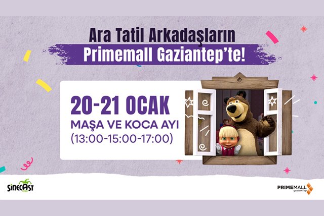 Primemall Gaziantep AVM, ara tatil boyunca çocuklara keyifli anlar yaşatacak Maşa ile Koca Ayı etkinliğine ev sahipliği yapmaya hazırlanıyor.